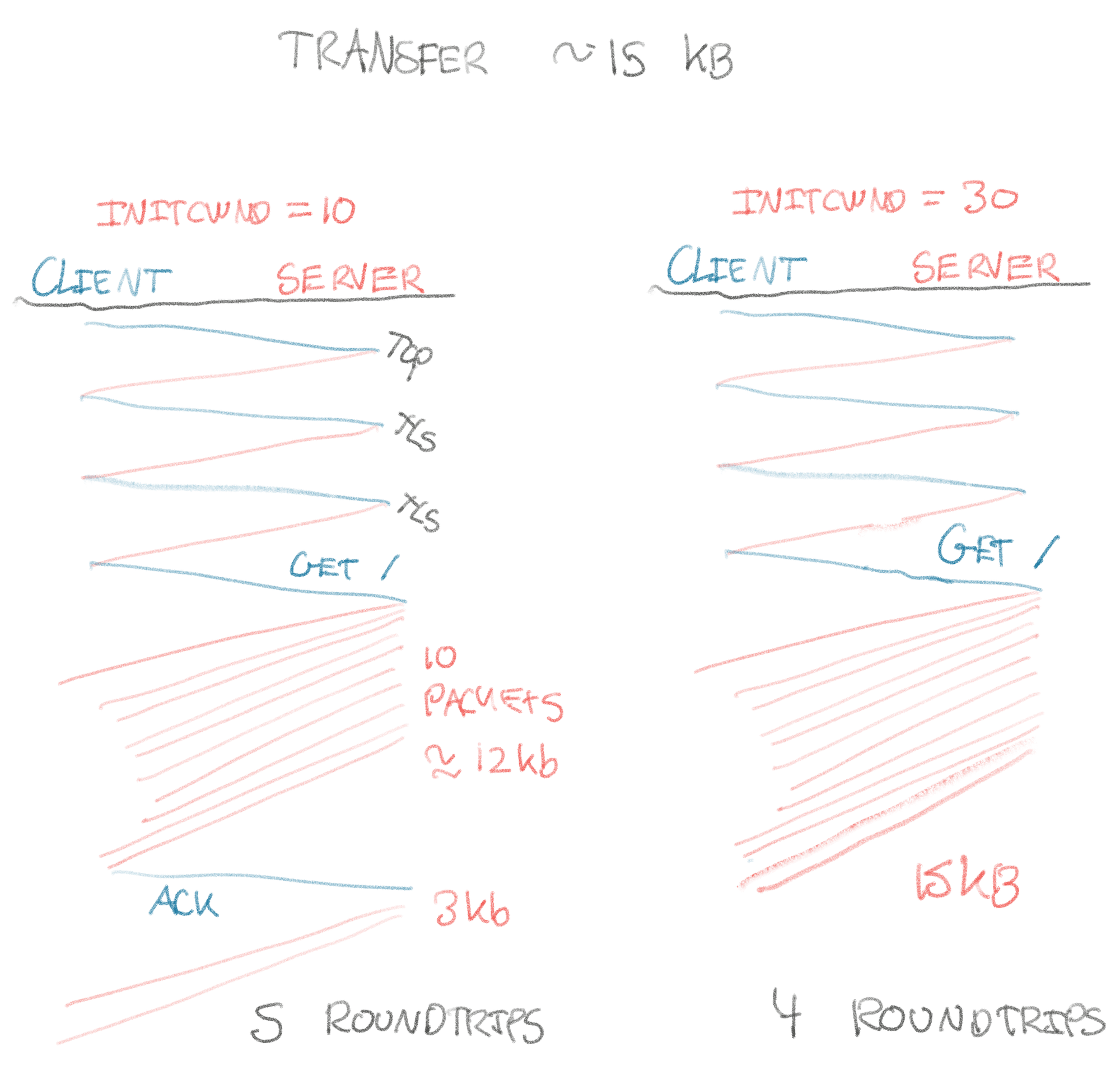 As we saw in the intro, it’s common among CDNs to raise the values from the default to e.g. 32 (~46kb). This makes sense, as you might be transmitting images of many megabytes. Waiting for TCP slow start to get to this point can take a few roundtrips.