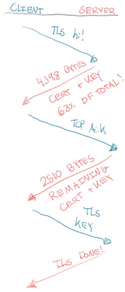 Put another way, the server’s TCP implementation has decided it’s not confident the poor client can receive that many tasty bytes all at once yet — so it sends a petty 4398 bytes of the certificate. Of course, 63% of a certificate isn’t enough to move on with the TLS handshake… so the client sighs, sends a TCP ACK back to the server, which then sends the meager 2510 left of the certificate so the client can move on to perform its part of the TLS handshake.