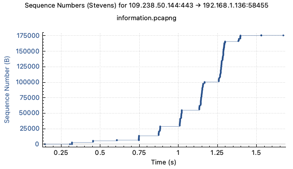 I’m not entirely sure why it follows a cubic function. I expected TCP slow start to just double every roundtrip. :shrug: As far as I can gather, on modern TCP implementation the congestion window is doubled every roundtrip until a packet is lost (as is the case for most other sites I’ve analyzed, e.g. the session in the screenshot below). After that we might move to a cubic growth. This might’ve changed later on? It’s completely up to the TCP implementation.