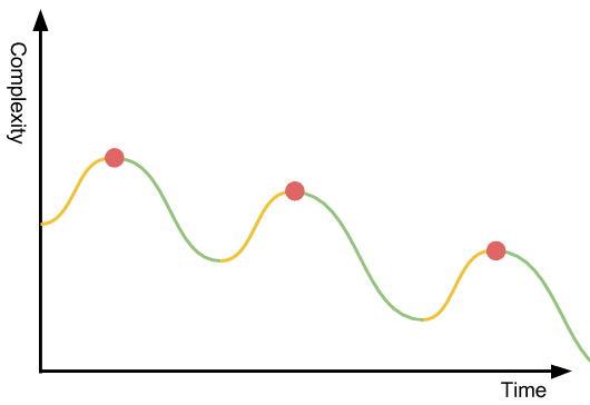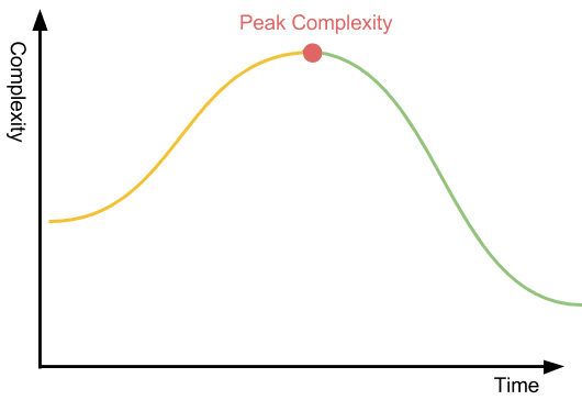 With the teams I work with, we operate with the idea of peak complexity: the time at which a project reaches its highest complexity. Peak complexity has proved a useful mental model to us for reasoning about complexity. It helps inform decisions about when to step back and refactor, how many people should be working on the project at a given point in time, and how we should structure the project.